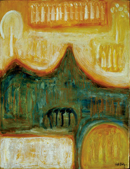 pottery of Banpo culture. Maybe a state of purity can be reached in this way. His picture is unsmooth deep and forceful. Sometimes he uses blue or orange tones to express the feeling of joyfulness and calmness.By solitary introspection , sense of sublimation can be got after surpassing common views. Figures and the